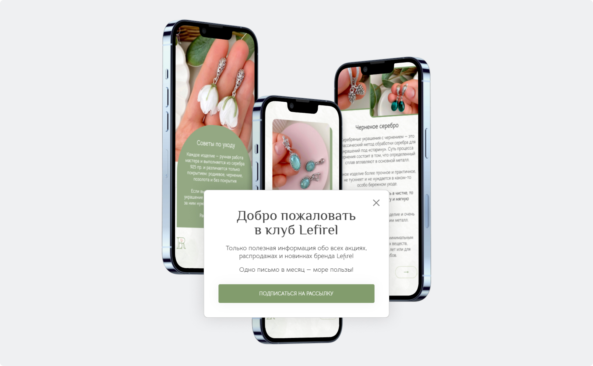 На главную страницу сайта добавили точку контакта — поп-ап с предложением оставить email. В обмен клиент получает ценность: скидку, участие в акции, доступ к закрытой информации, полезные статьи по подбору украшений и уходу за изделиями. Так бренд не просто получает контакты потенциальных покупателей, а создает инструмент для удержания. По статистике, рассылка возвращает до 20–25% покупателей, которые иначе бы ушли навсегда.