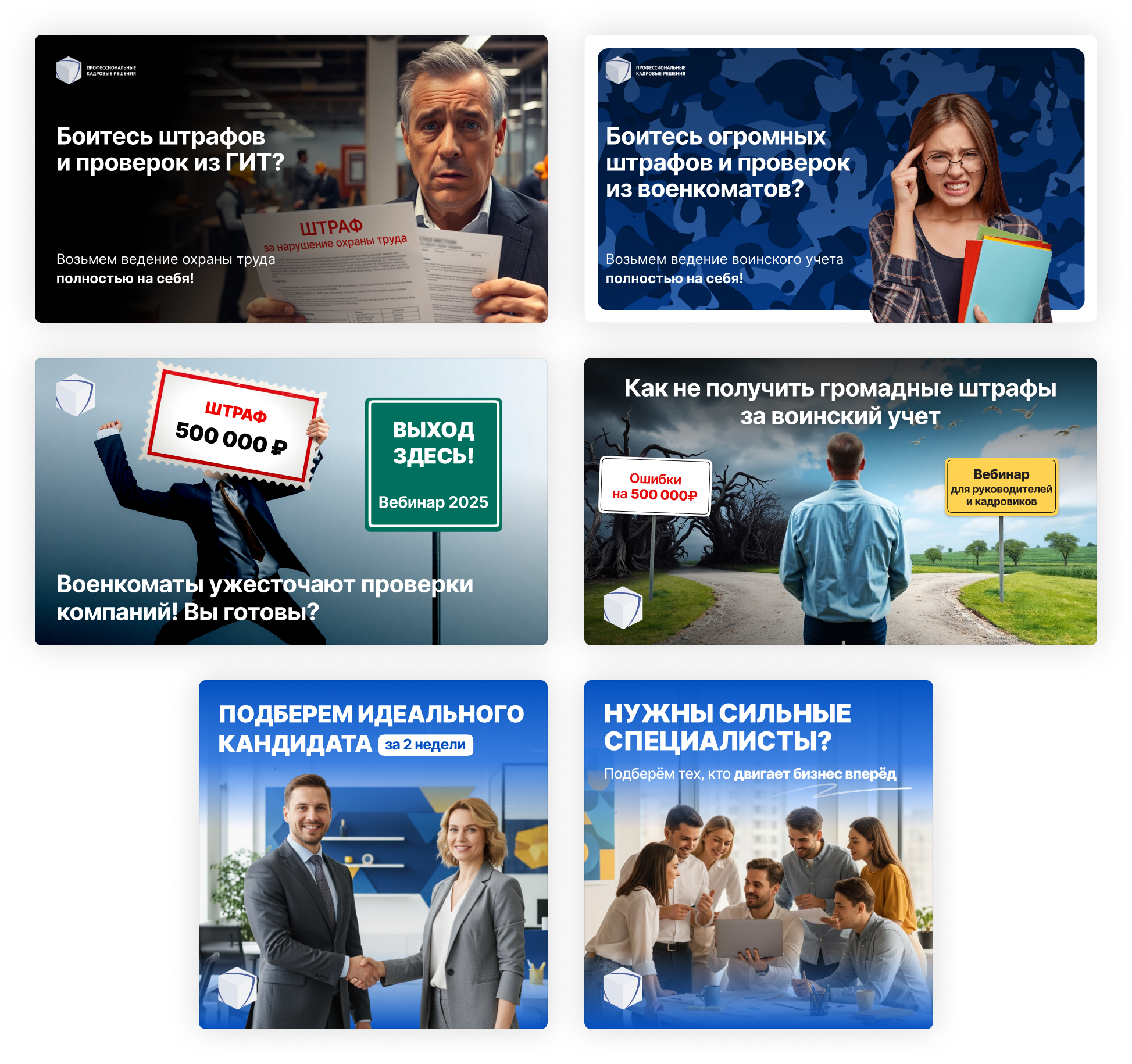 Результаты первых месяцев были показательными. Например, в кадровом делопроизводстве стоимость квалифицированного лида снизилась с 21 718 ₽ до 3 924 ₽ при стабильном количестве заявок. В охране труда мы получили лиды с ценой 6 064 ₽ (было 10 156 ₽), что позволило расширить базу клиентов и одновременно протестировать разные креативы и офферы. По воинскому учету стоимость квалифицированного лида сначала была 13 756 ₽, а после оптимизации и перераспределения бюджета опустилась до 4 682 ₽.