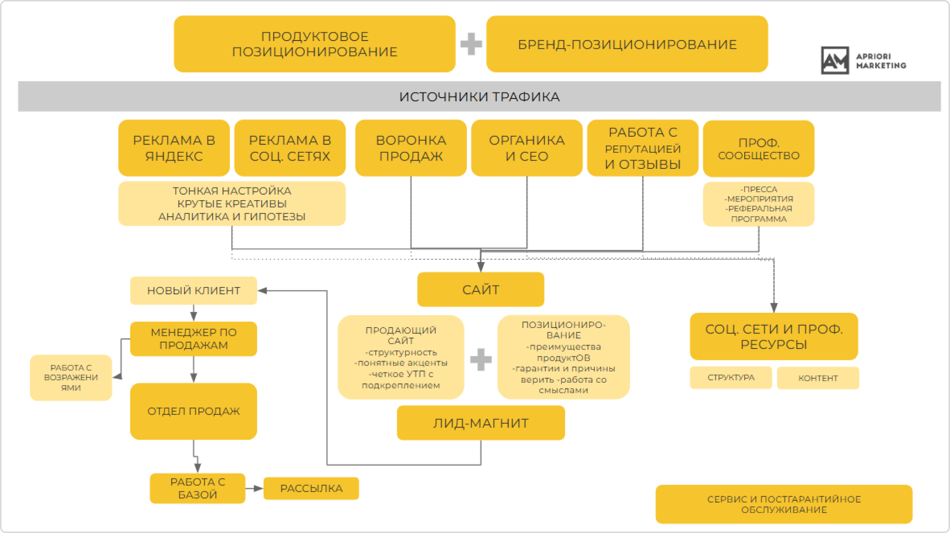 - выстроить фундаментальную маркетинговую систему: от позиционирования и контента до инструментов отдела продаж, PR и аналитики.