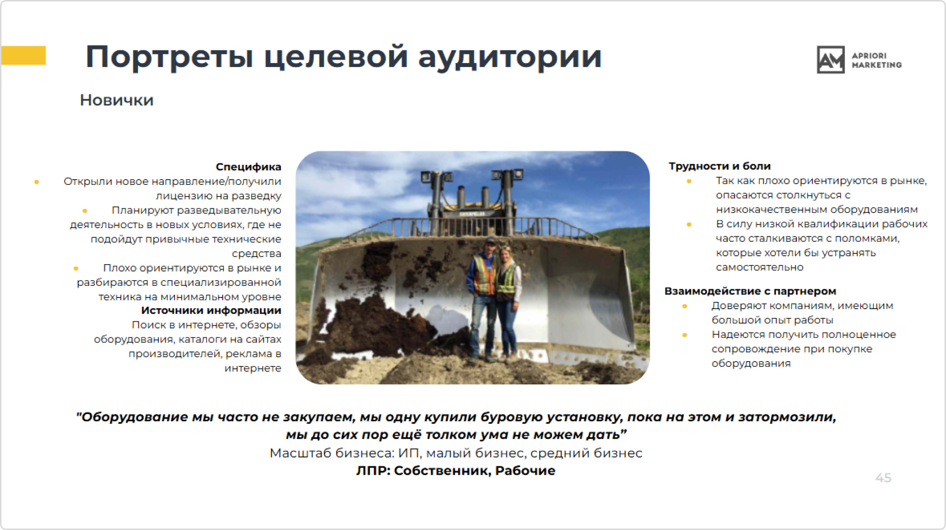 Это компании, которые давно работают на рынке и берут технику под конкретные задачи. Их главная боль — срыв сроков и убытки из-за качества или доставки. Они выбирают партнера по соотношению «цена + сроки», но всегда обращают внимание на репутацию. Для них важен визит на производство: нужно убедиться, что за обещаниями стоит реальный завод. - Новички.